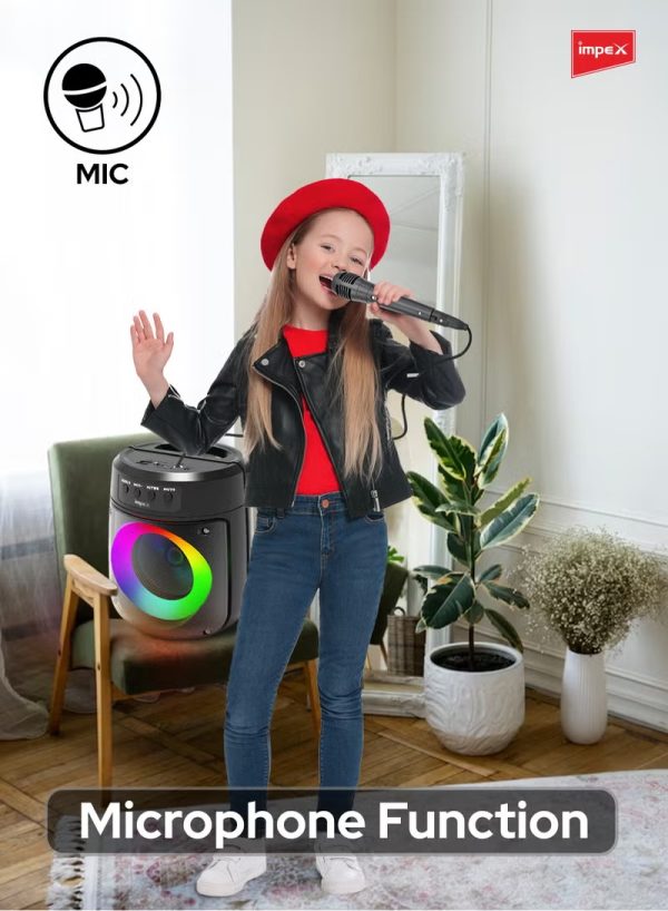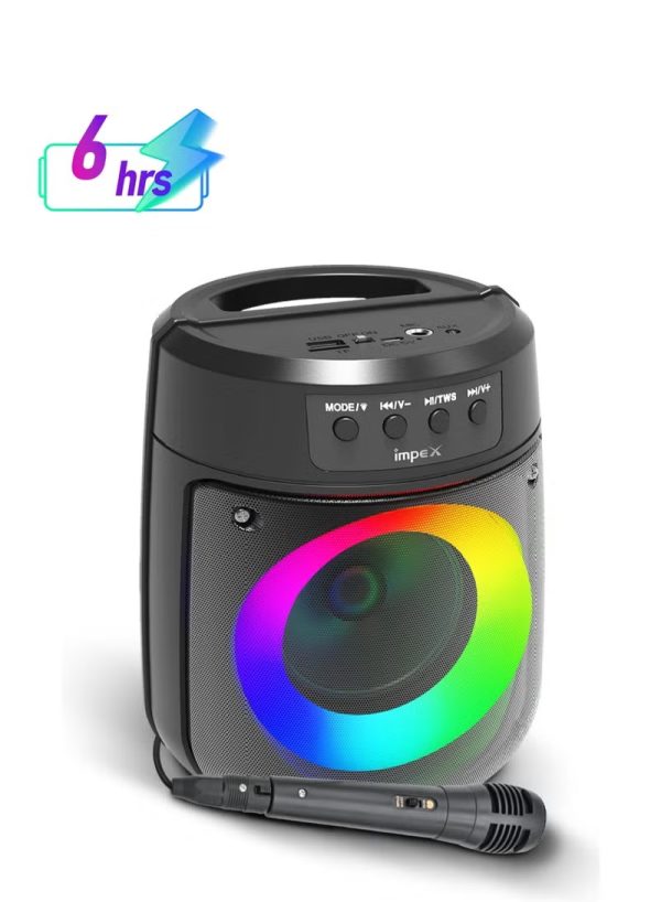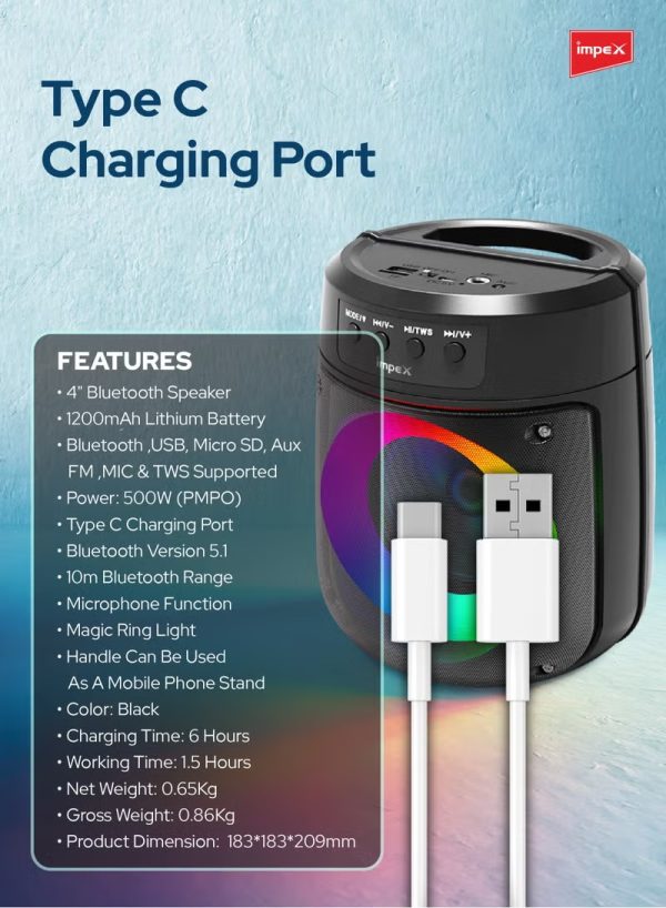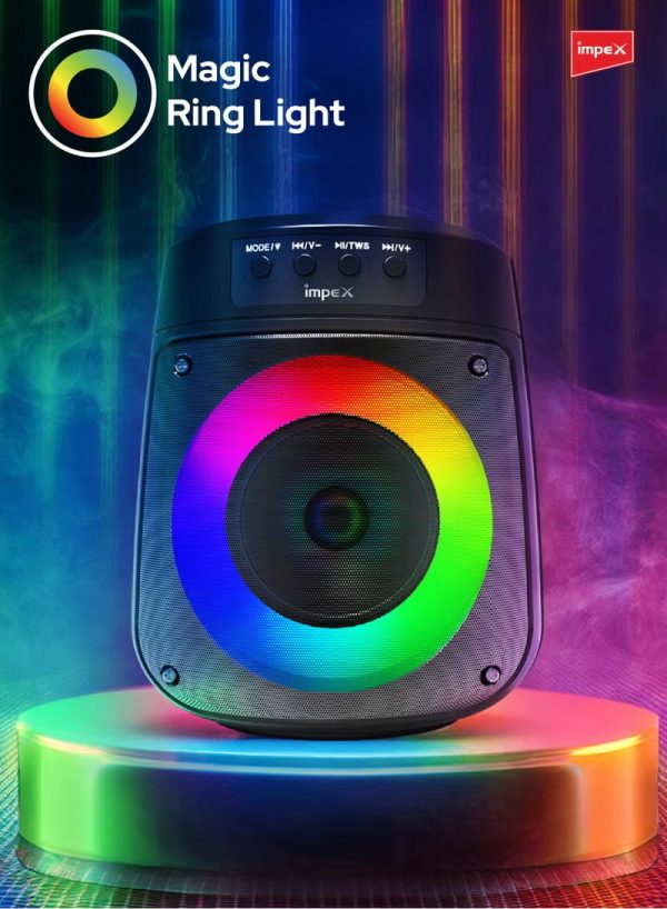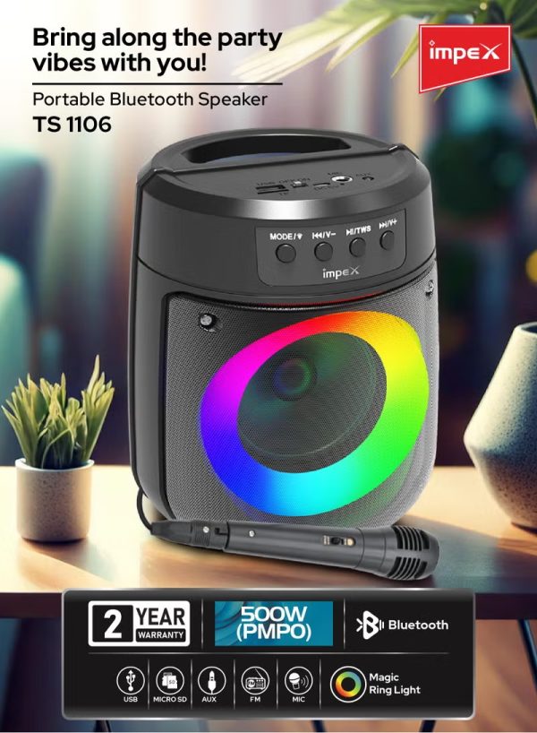 Experience powerful sound and captivating visuals with the Impex TS 1106 Portable Bluetooth Speaker. Boasting a 500W PMPO output and a compact 4-inch speaker, this device delivers crystal-clear audio for any occasion. The innovative Magic Ring Light enhances your party ambiance, while the 1200mAh lithium battery ensures reliable performance. Featuring Bluetooth 5.1 technology, it offers seamless connectivity up to 10 meters, making it perfect for indoor and outdoor use. Enjoy versatile input options including USB, Micro SD, AUX, FM, MIC, and TWS support for true wireless stereo. The Type-C charging port ensures quick and efficient charging within 6 hours, providing up to 1.5 hours of playback. Equipped with a wired microphone, it’s ideal for karaoke nights, speeches, or announcements. Its portable design includes a convenient handle that doubles as a mobile stand, adding to its practicality. Whether you’re hosting a party, relaxing at home, or enjoying an outdoor gathering, the Impex TS 1106 Bluetooth Speaker is your ultimate audio companion. Its durable build and sleek black finish make it stylish and functional, backed by a 2-year warranty for peace of mind. Bring your favorite music to life with immersive sound quality and versatile features.